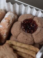 | Ingrédients | Farine de BLE T65, BEURRE, sucre, OEUF, jaune d'OEUF, poudre à lever, poudre d'AMANDE, vanille, fleur de Sel, amidon de mais, sucre glace, orange et citron confits, chocolatnoir 69%, lécithine de tournesol, poudre de NOIX, poudre de PISTACHE, épices vanille amoureuse (cannelle, vanille de Papouasie, mélilot, cônes de sapin, gingembre, poivre long, rose d'Ispahan, poivre blanc, fenugrec), mélange à pain d'épices (cannelle, clou de girofle, badiane, fenouil, poivre blanc, noix de muscade, anis, cardamome, gingembre, coriandre), confiture de framboise |